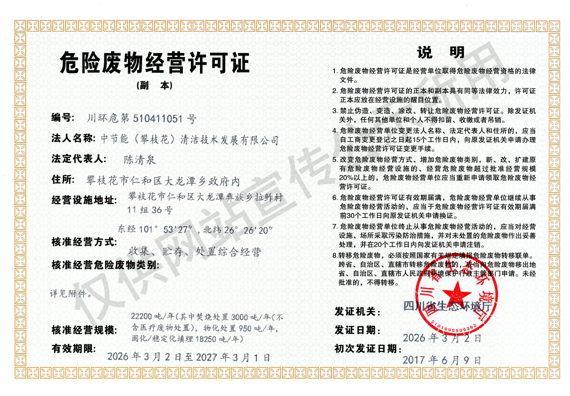 中節(jié)能(攀枝花)清潔技術(shù)發(fā)展有限公司(以下簡(jiǎn)稱(chēng)公司)成立于2008年5月,注冊(cè)資金1.6519億元。公司由中節(jié)能清潔技術(shù)發(fā)展有限公司和攀枝花市產(chǎn)業(yè)投資經(jīng)營(yíng)有限責(zé)任公司共同持股,并由中節(jié)能清潔技術(shù)發(fā)展有限公司控股經(jīng)營(yíng)。公司投資建設(shè)和運(yùn)營(yíng)的攀枝花市危險(xiǎn)廢物處置中心項(xiàng)目是全國(guó)統(tǒng)籌部署的全國(guó)31個(gè)危險(xiǎn)廢物綜合處置中心項(xiàng)目之一,位于攀枝花市仁和區(qū)大龍?zhí)多l(xiāng)迤資村華賣(mài)社,核準(zhǔn)處理原生廢物2.425萬(wàn)噸/年,可對(duì)43大類(lèi),447項(xiàng)(醫(yī)療廢物)進(jìn)行安全處置。