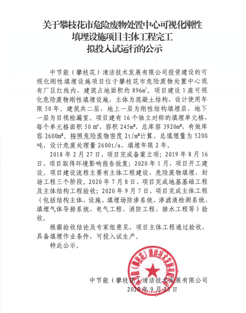 關(guān)于攀枝花市危險廢物處置中心可視化剛性填埋設施項目主體工程完工擬投入試運行的公示